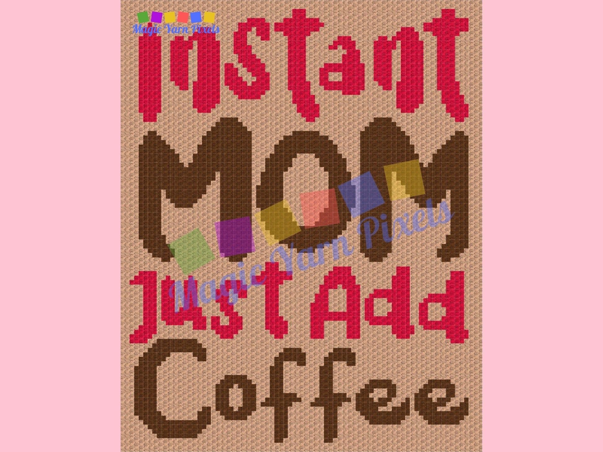 "Instant Mom Just Add Coffee" is a DIGITAL DOWNLOAD (available in PDF format only), written in ENGLISH ONLY that can be used to crochet a blanket using various techniques, such as C2C, Mini C2C, SC, HDC, DC, Tapestry Crochet etc.