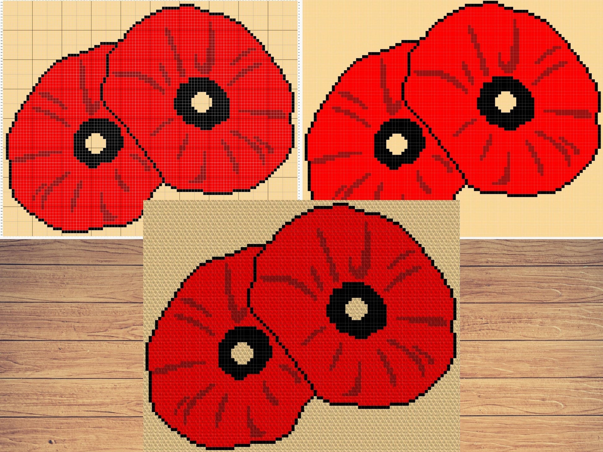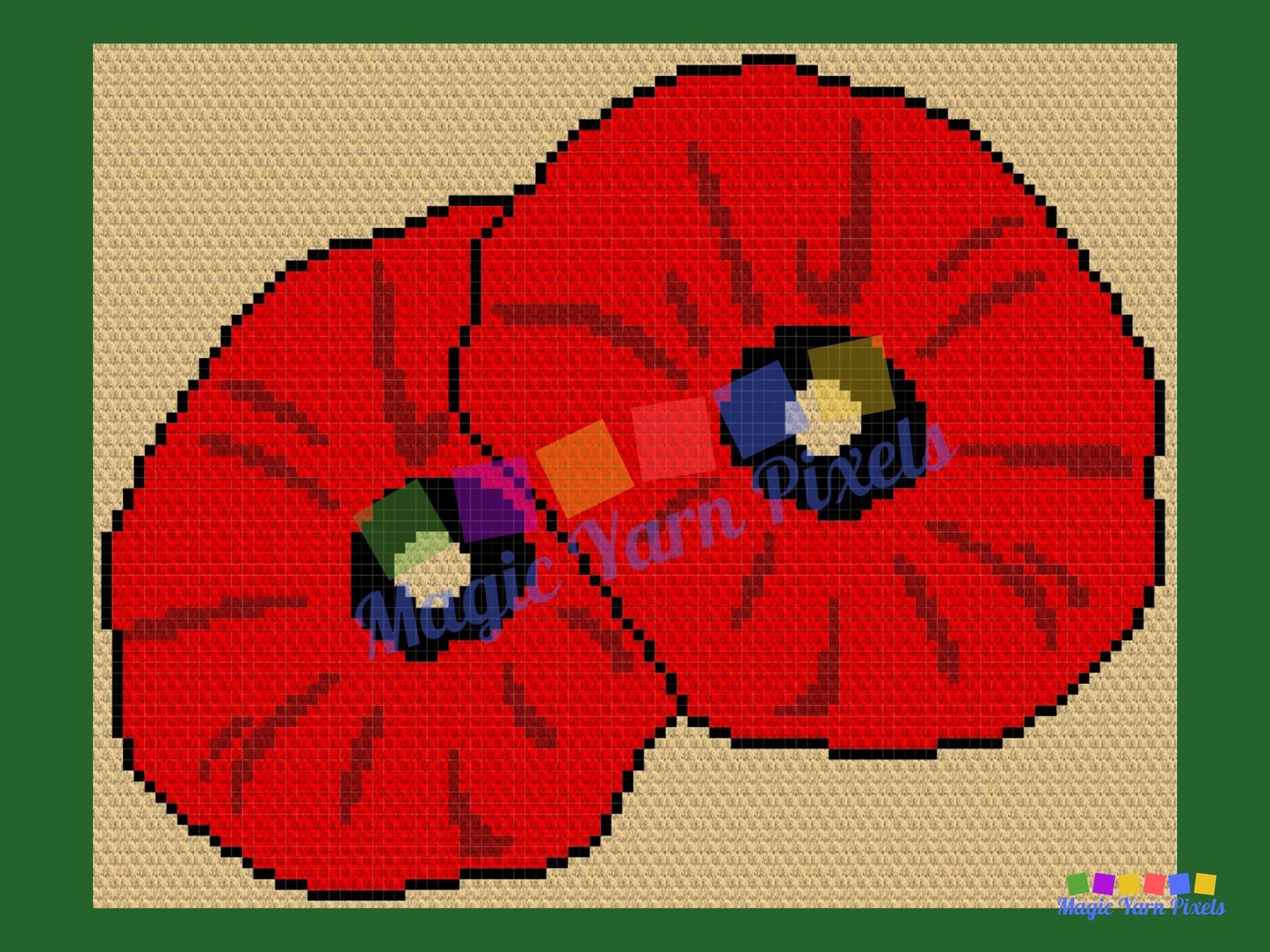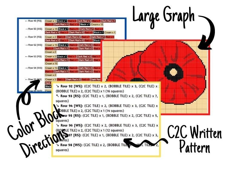 Poppy Flowers Graph + Written Pattern For C2C & Tapestry Crochet - C2C Poppy Crochet Pattern - Flower Crochet Blanket Baby Afghan C2C Chart