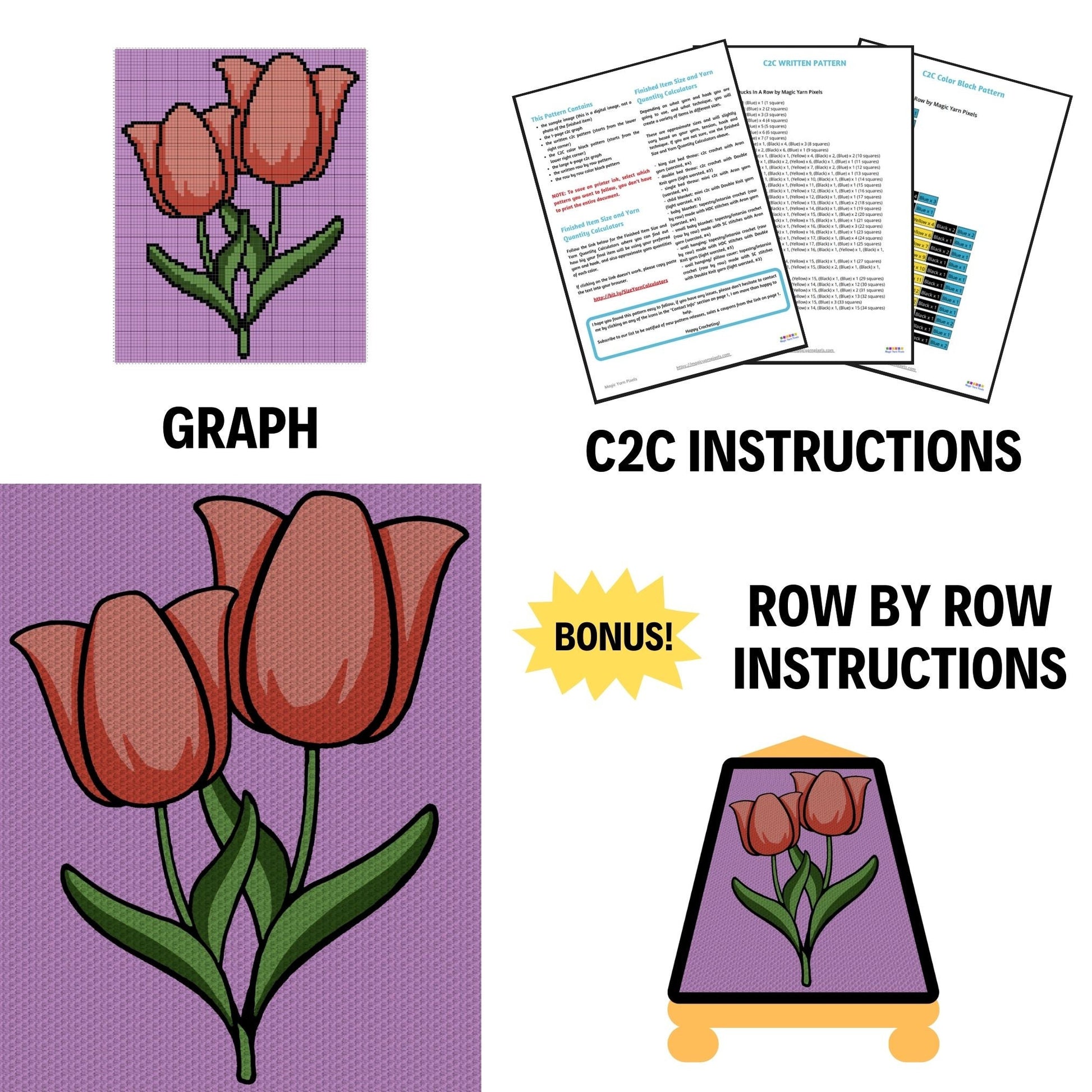 "Tulip Bouquet" is a DIGITAL DOWNLOAD (available in PDF format only), written in ENGLISH ONLY that can be used to crochet a blanket using various techniques, such as C2C, Mini C2C, SC, HDC, DC, Tapestry Crochet etc.